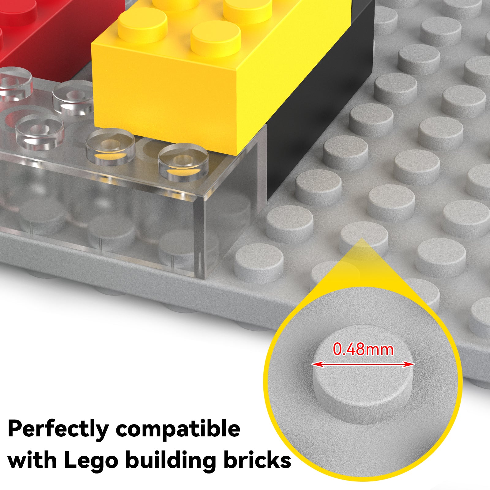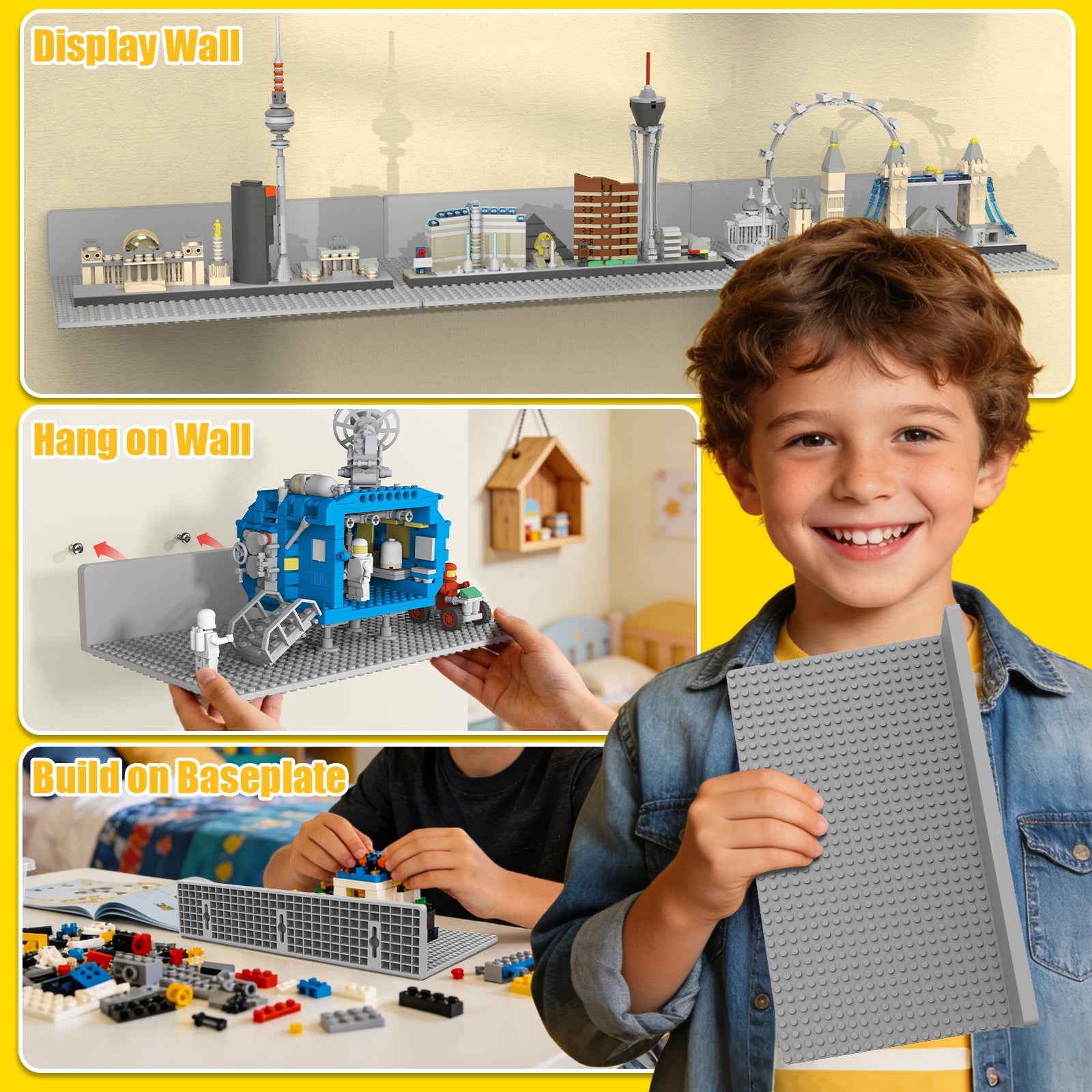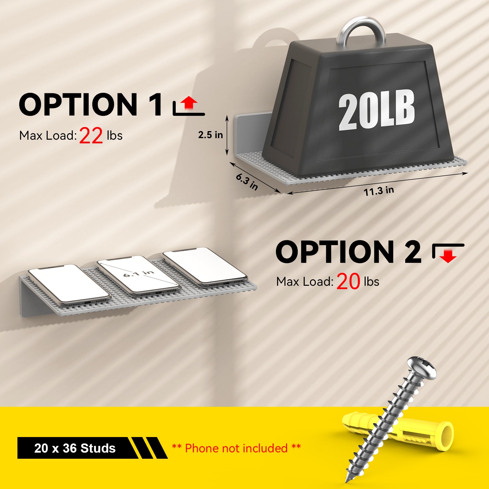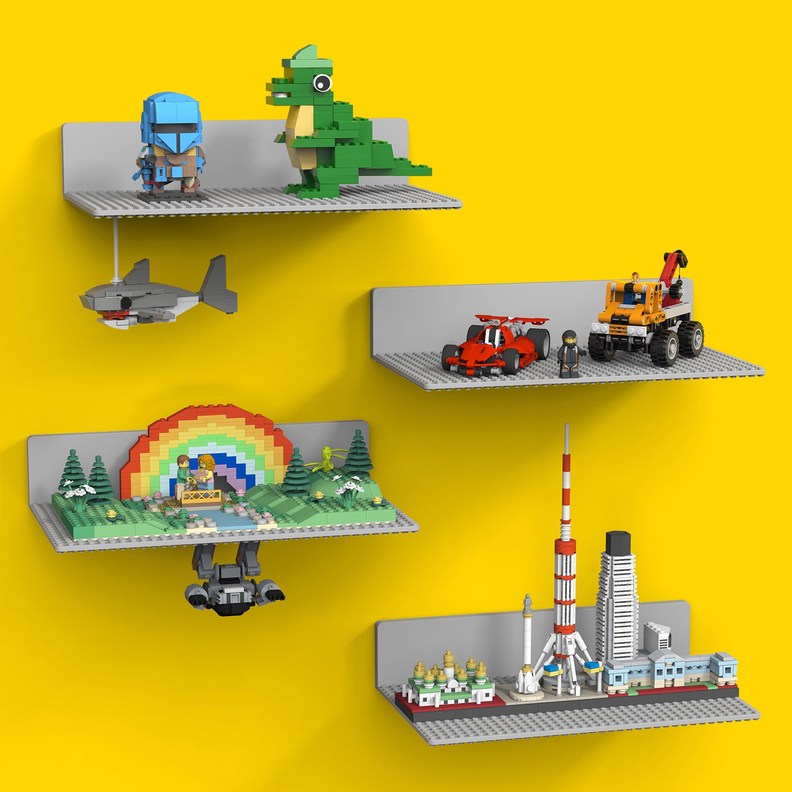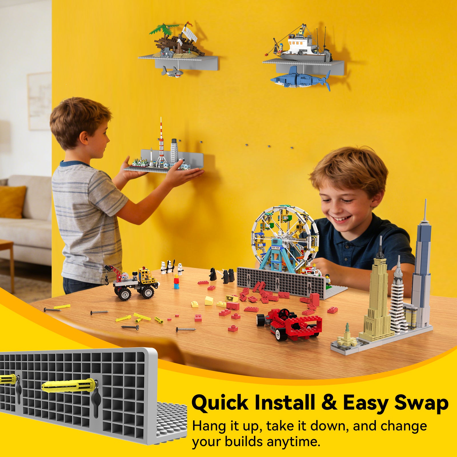 Each 5 x 5.5 inch floating shelves comes with a dual-sided 16x17 stud baseplate with 0.19 inches (4.8mm) studs, compatible with all standard LEGO bricks and other compatible brands. Perfect for small to medium-sized creations, it keeps your builds secure—no slipping or tilting. Plus, the best part: you can even attach bricks to the underside without worrying about them falling off.