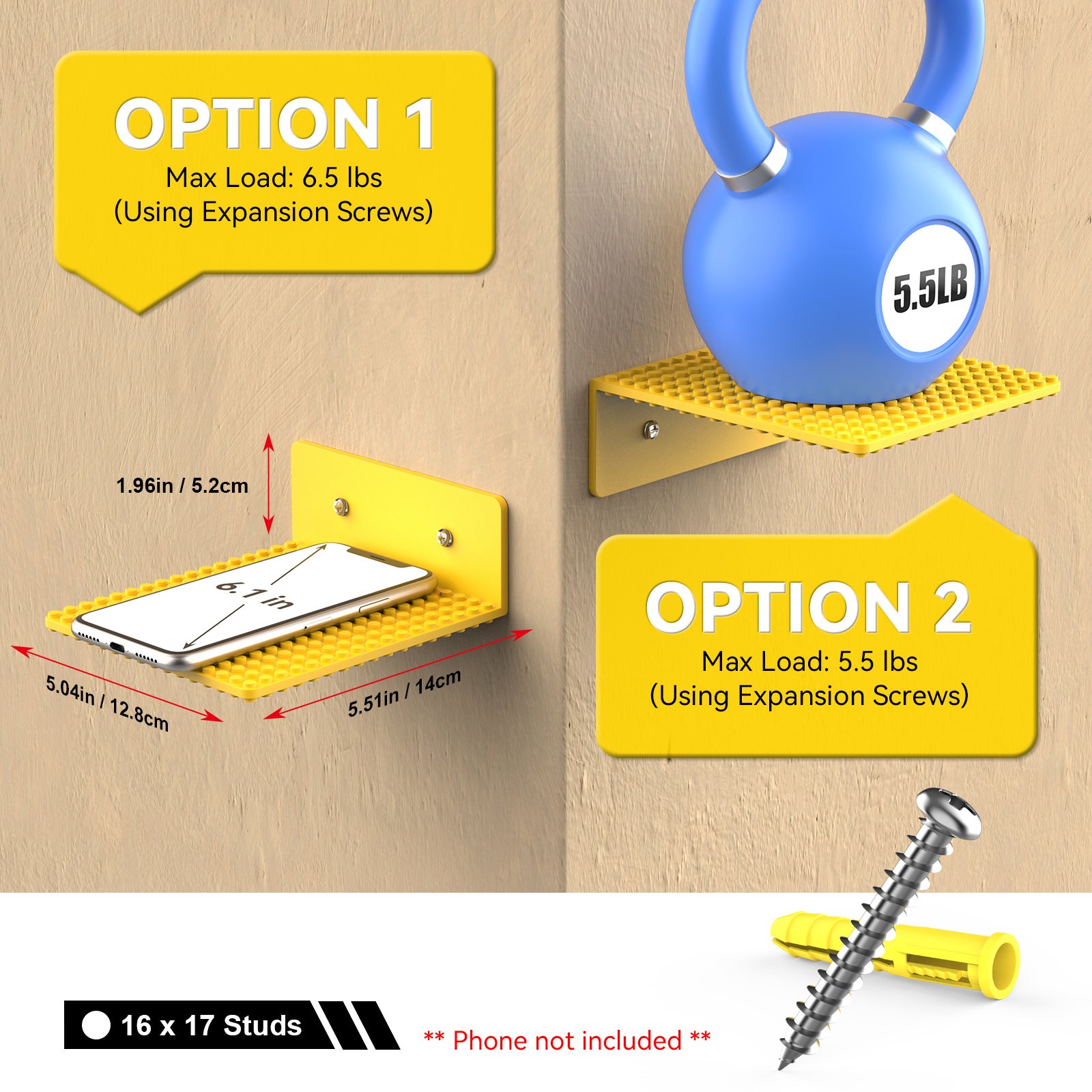 Each 5 x 5.5 inch floating shelves comes with a dual-sided 16x17 stud baseplate with 0.19 inches (4.8mm) studs, compatible with all standard LEGO bricks and other compatible brands. Perfect for small to medium-sized creations, it keeps your builds secure—no slipping or tilting. Plus, the best part: you can even attach bricks to the underside without worrying about them falling off.